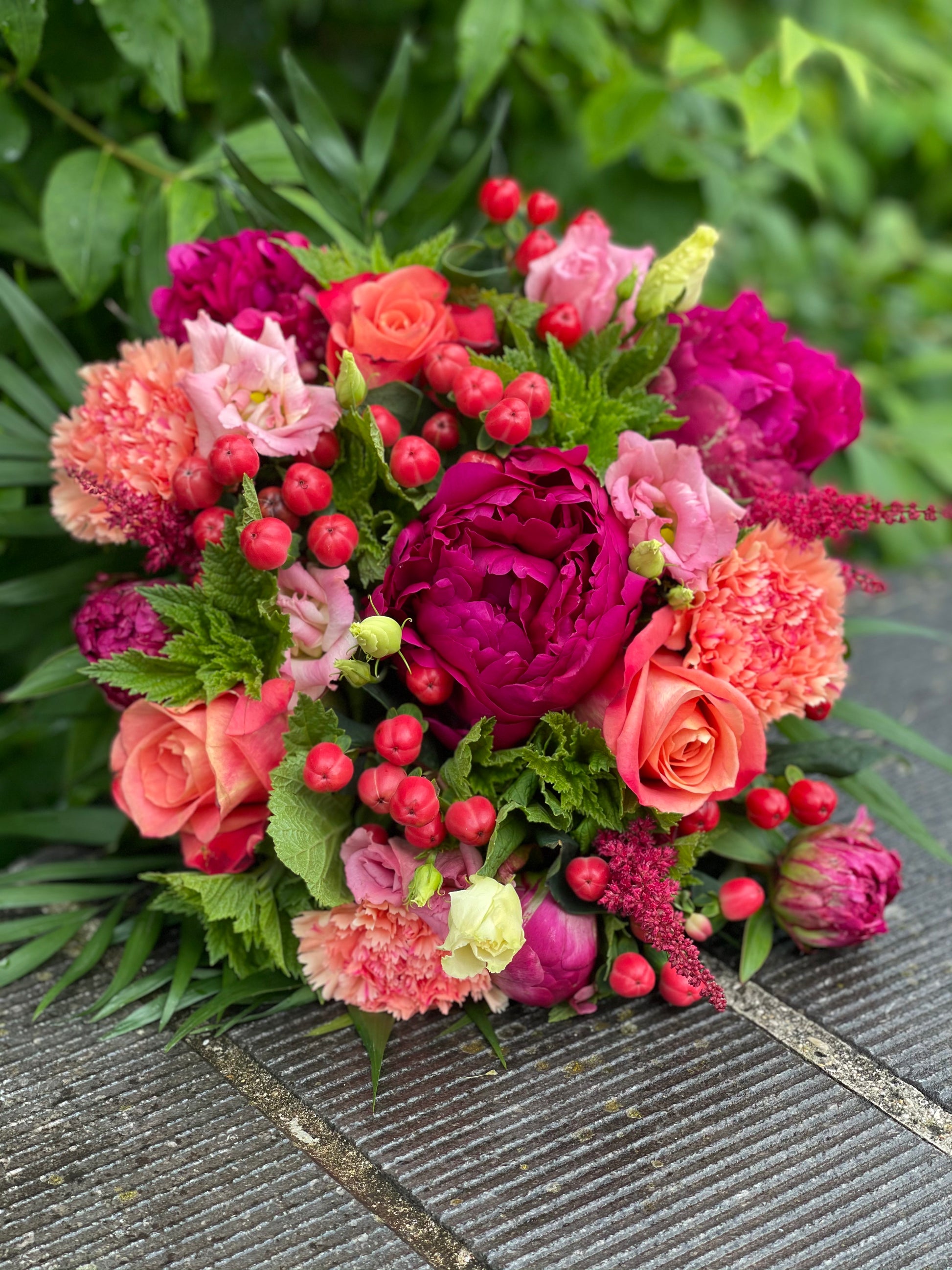 Bouquet de fleurs variées fuschia/orange/rouge et rose pâle