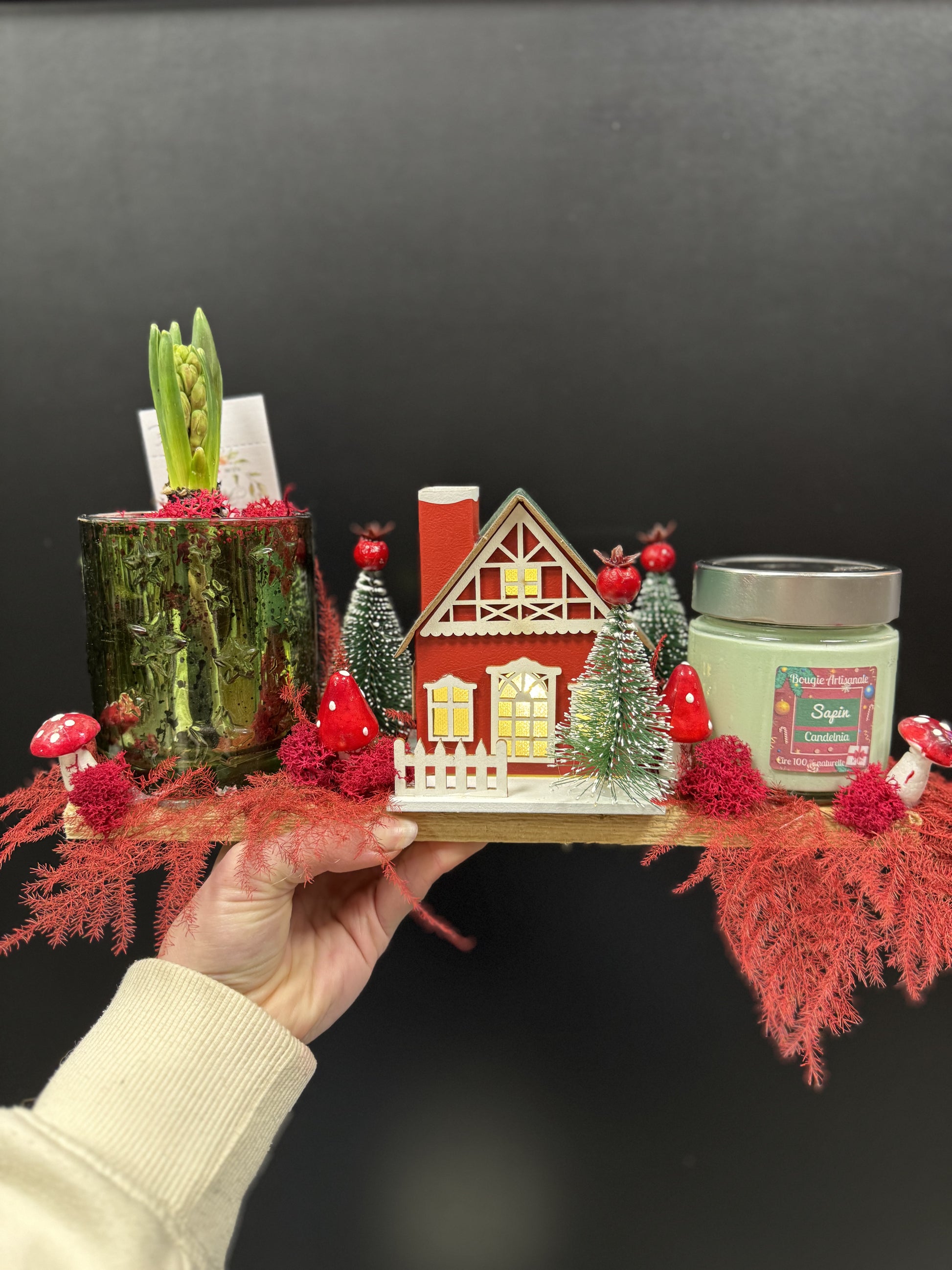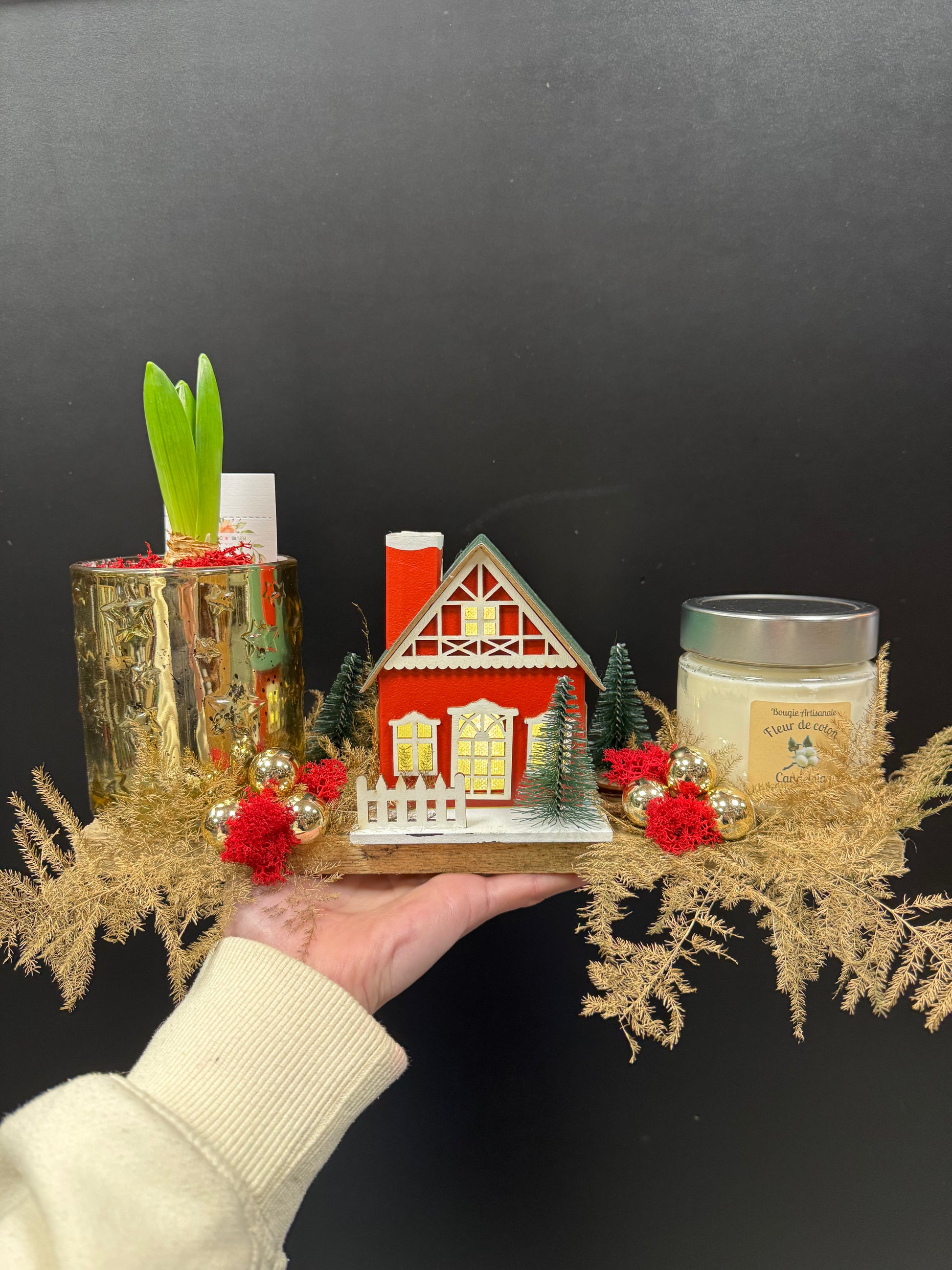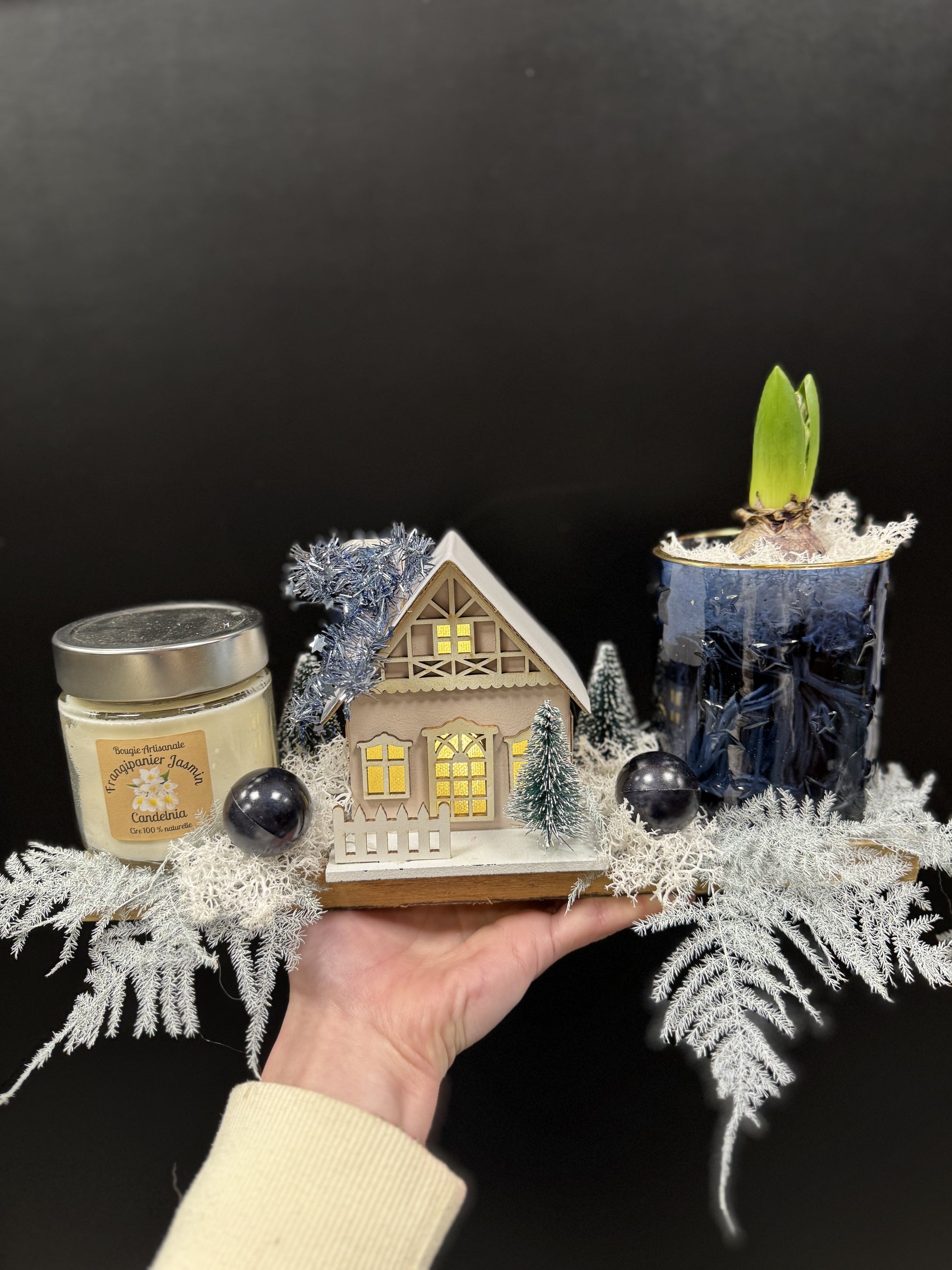 Joli centre de table avec une petite maison qui s'allume. En collaboration avec Candelnia.