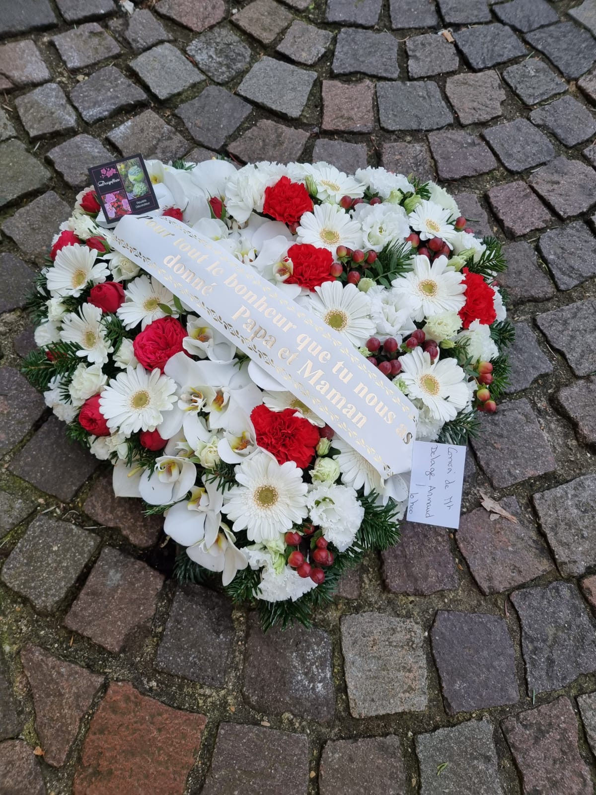 Le coeur est une pièce de deuil réalisée avec différentes variétés de fleurs fraîches. Celle-ci sont piquées dans de la mousse imbibée d'eau.