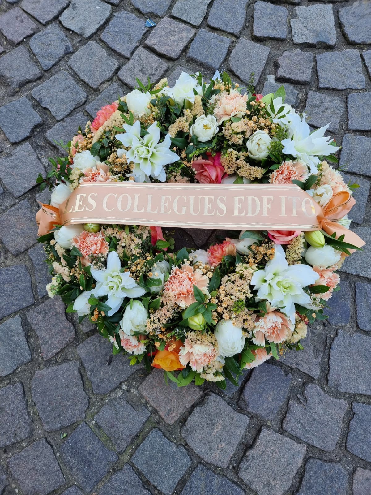 La couronne est une pièce de deuil réalisée avec différentes variétés de fleurs fraîches. Celle-ci sont piquées dans de la mousse imbibée d'eau.