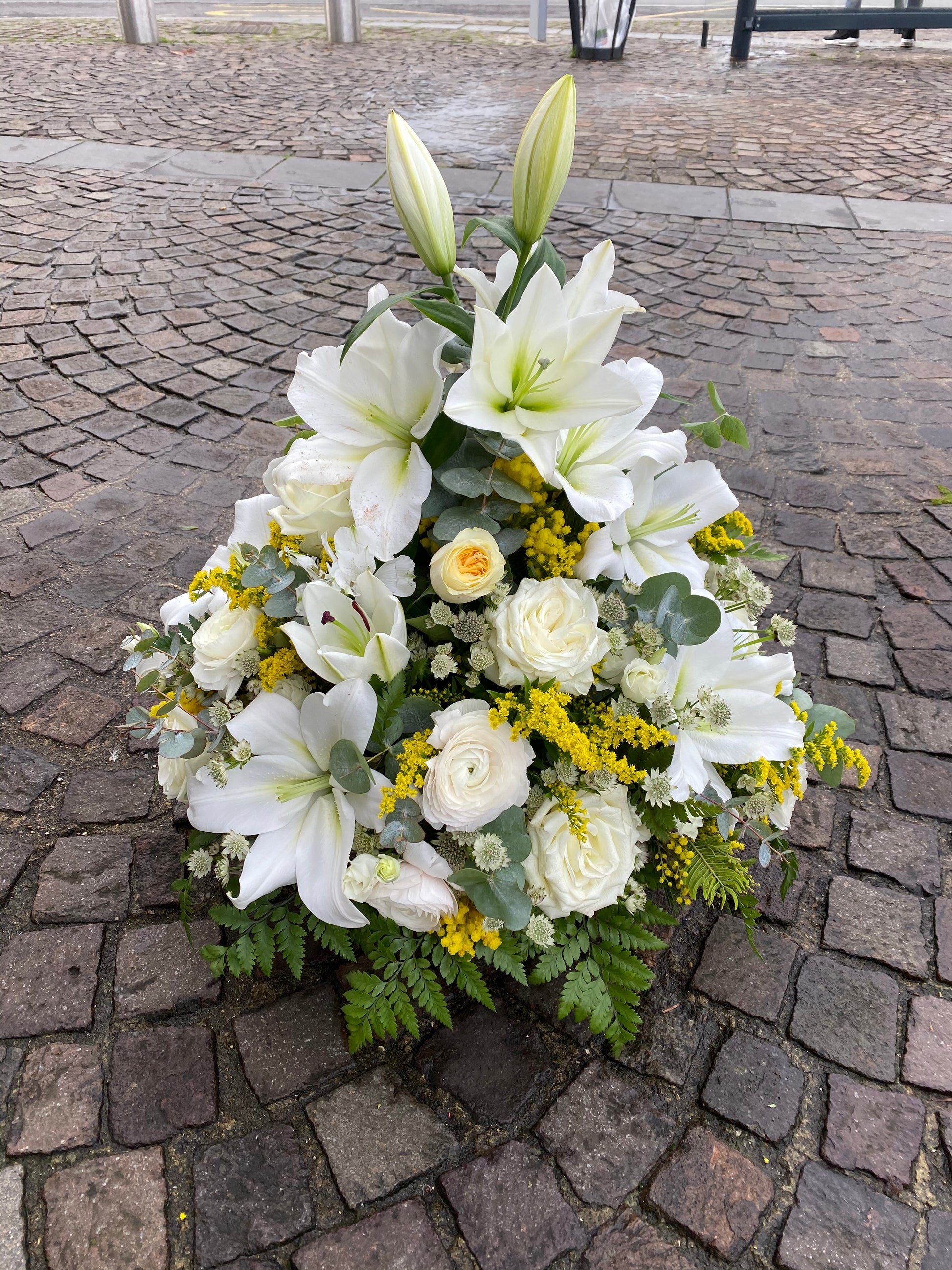 Le coussin conique est une pièce de deuil en hauteur réalisée avec différentes variétés de fleurs fraîches. Celle-ci sont piquées dans de la mousse imbibée d'eau.