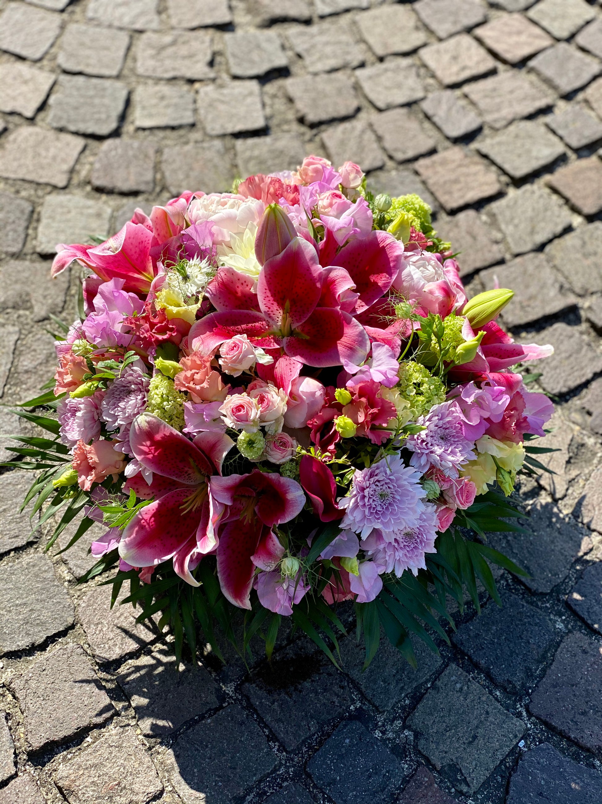 Le coussin rond est une pièce de deuil réalisée avec différentes variétés de fleurs fraîches. Celle-ci sont piquées dans de la mousse imbibée d'eau.