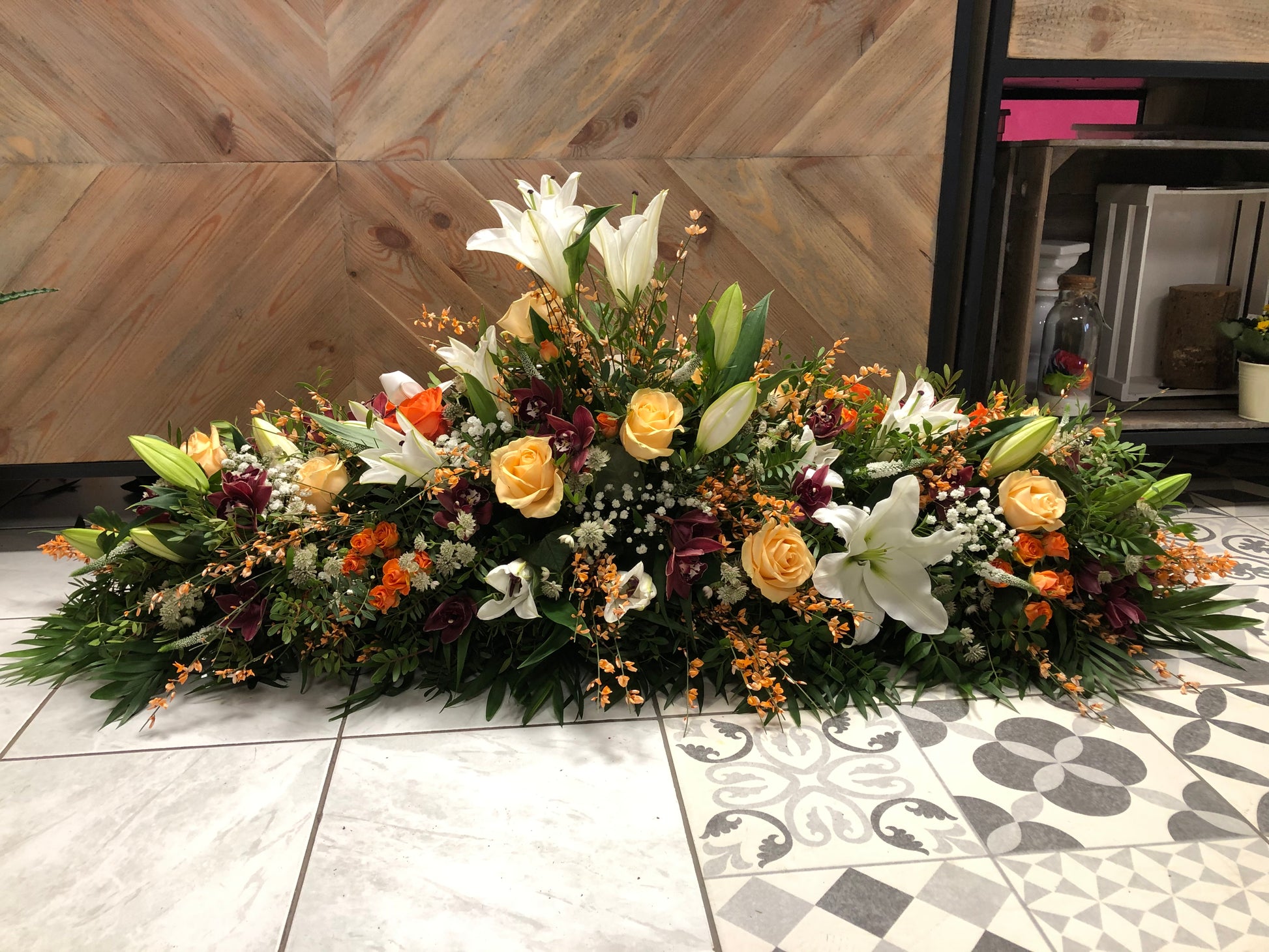 La raquette est une pièce de deuil réalisée en longueur avec différentes variétés de fleurs fraîches. Celle-ci sont piquées dans de la mousse imbibée d'eau.