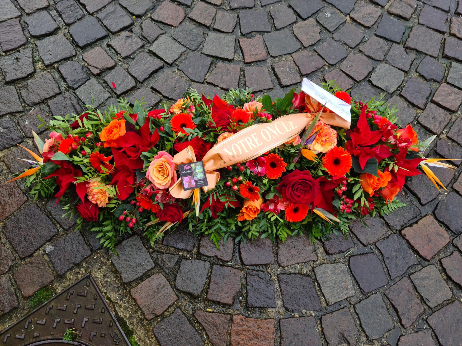 La raquette est une pièce de deuil réalisée en longueur avec différentes variétés de fleurs fraîches. Celle-ci sont piquées dans de la mousse imbibée d'eau.